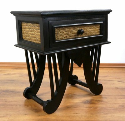 Black french side table bedside nightstand with rattan.